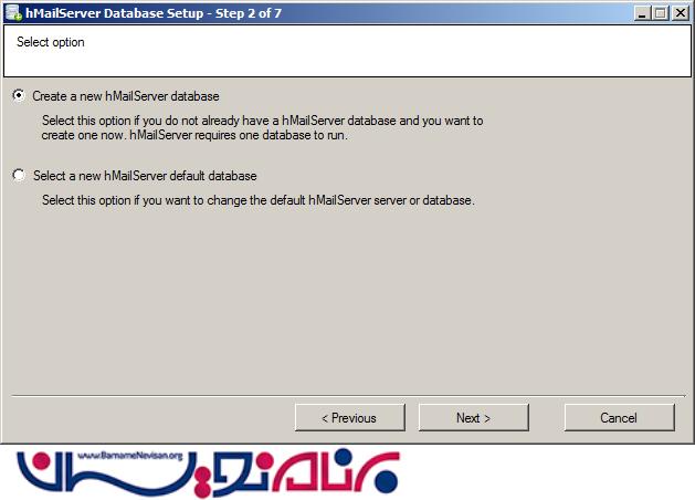 گزینه “Create a new hMailServer Database” را انتخاب کرده و روی دکمه Next کلیک می کنیم و سپس Microsoft SQL Server را انتخاب کرده و دوباره روی Next کلیک می کنیم.