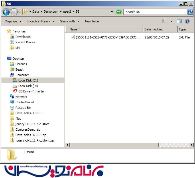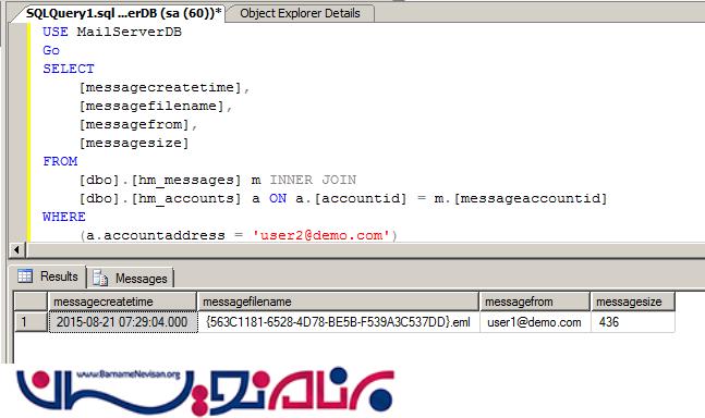 در این کوئری چک کردیم که آیا user2 از uder1 ایمیلی دریافت کرده است یا خیر، همانطور که می بینیم user2 ایمیل را دریافت کرده است. همه ایمیل ها در یک فولدر و به صورت رمزشده نگه داری می شود.