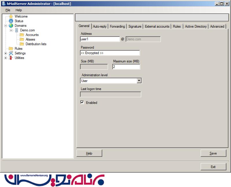 3 فیلد مربوط به آدرس، پسورد و حداکثر سایز را پرکرده و روی دکمه Save کلیک می کنیم. کاربر دیگری را هم به همین ترتیب ایجاد می کنیم. حال ما یک دامنه به نام “Demo.com’ با دو کاربر ایجاد کردیم. (user1@demo.com, user2@demo.com)