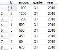 CREATE TABLE tblRevenue ( Id int Primary Key IDENTITY(1,1) NOT NULL, amount bigint NULL, quarter varchar(4) NULL, year varchar(4) NULL, )