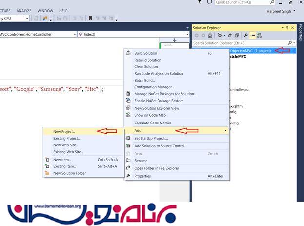 روی solution راست کلیک می کنیم و گزینه add وسپس New project را انتخاب میکنیم.