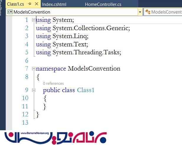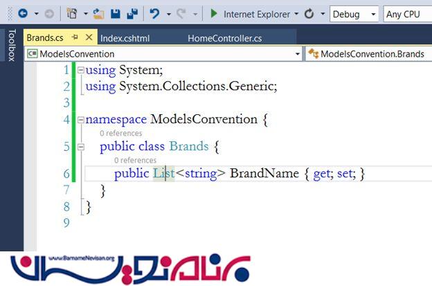 نام class1.cs را به brands تغییر می دهیم و کد های زیر را داخل آن می نویسیم.