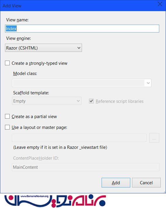 برای انتقال داده ها ازcontroller به یک view ، از شی داینامیک mvc استفاده می کنیم. با استفاده از ViewBag داده ها را به view ارسال می کنیم. قبل از ارسال داده ها به view، باید یک view اضافه کنیم روی متد Index راست کلیک می کنیم و گزینه Add view را انتخاب می کنیم و نام آن را Index قرار می دهیم.