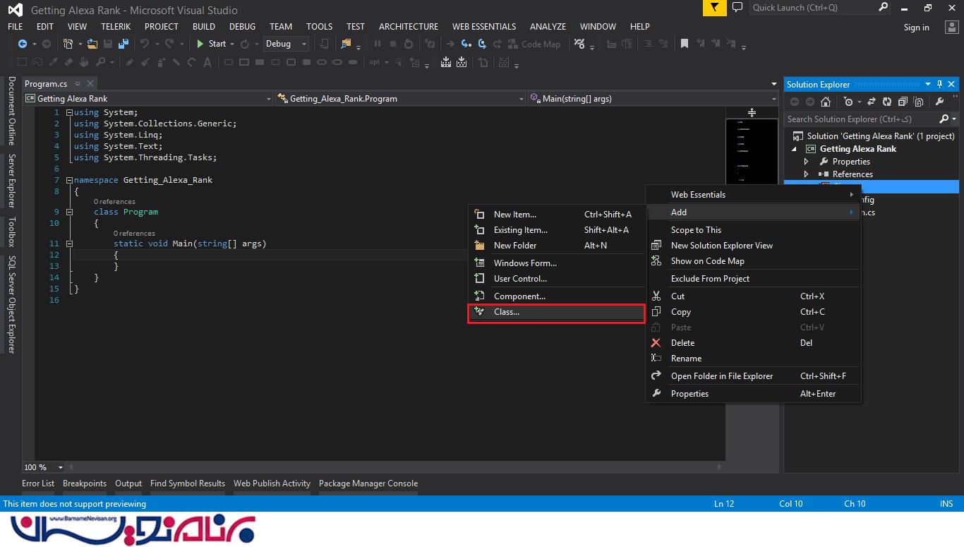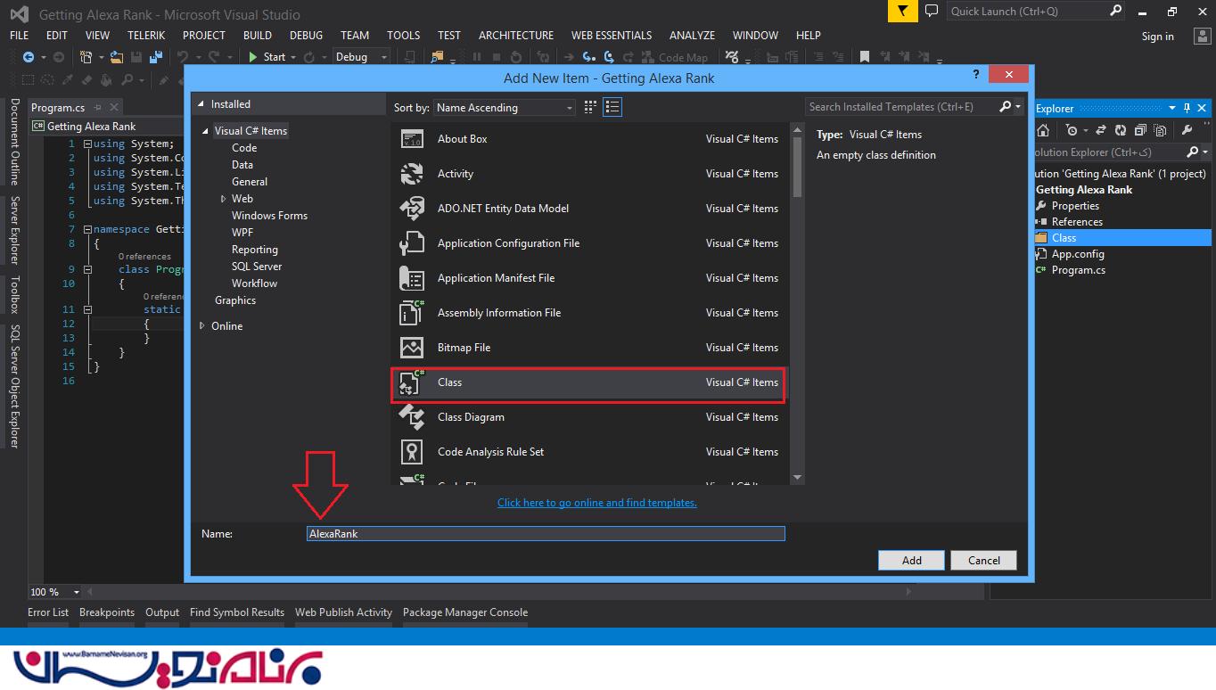 نام کلاس را برابر AlexaRank قرار داده و آن را اضافه می کنیم.