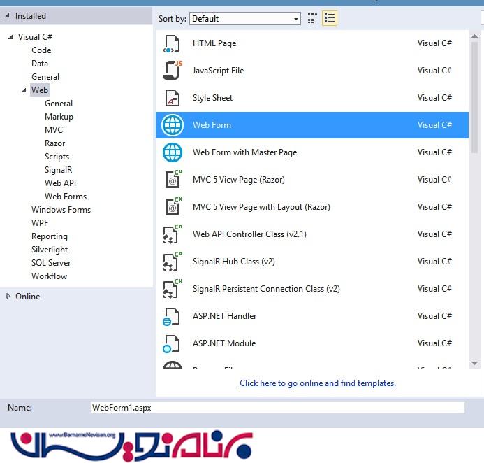 پس از ایجاد پروژه، روی نام آن راست کلیک کرده و یک web form به برنامه اضافه کنید.