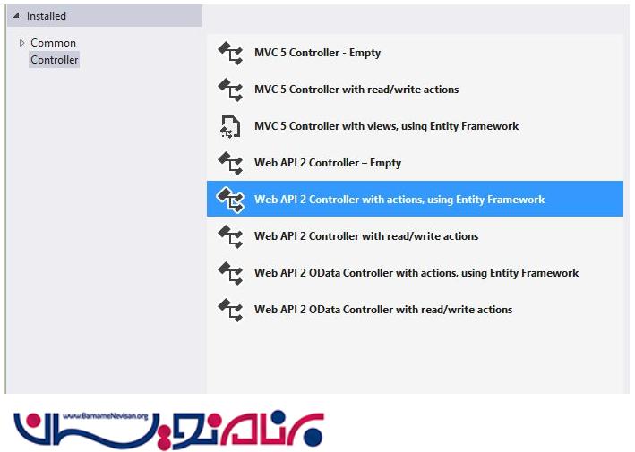 حال روی کنترلر راست کلیک کرده ویک کنترلر از نوع WebAPI ایجاد میکنیم