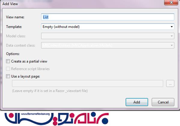 روی نام متد کلیک راست کرده و Add View را انتخاب می کنیم و مانند زیر یک ویو برای این متد می سازیم.