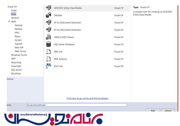 دراین مرحله روی Modles راست کلیک کرده و در گزینه New Item ، Addرا انتخاب کرده و گزینه ADO.NET Entity Data Model رابرای اضافه کردن بانک اطلاعاتی به برنامه خود انتخاب میکنیم.