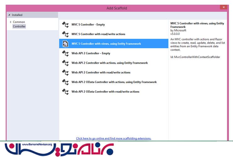 همان طور که از تصویر معلوم است روی Controller. راست کلیک کرده وAddرا میزنیم و یک کنترلر. ،از نوع Controller with views, using Entity Framework MVC 5 ایجاد میکنیم.
