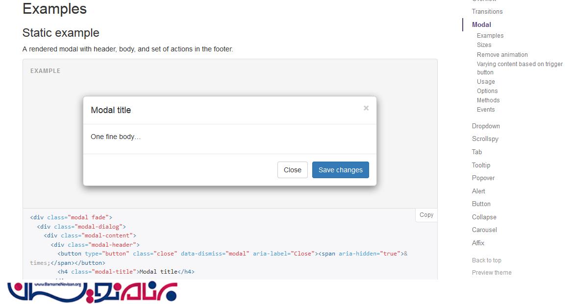 حال در سایت getbootstrap.com رفته و در قسمت Java Script یک نوع از modelهایی را میپسندید را انتخاب کنید