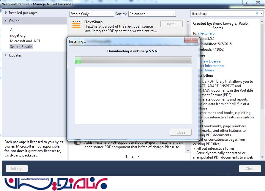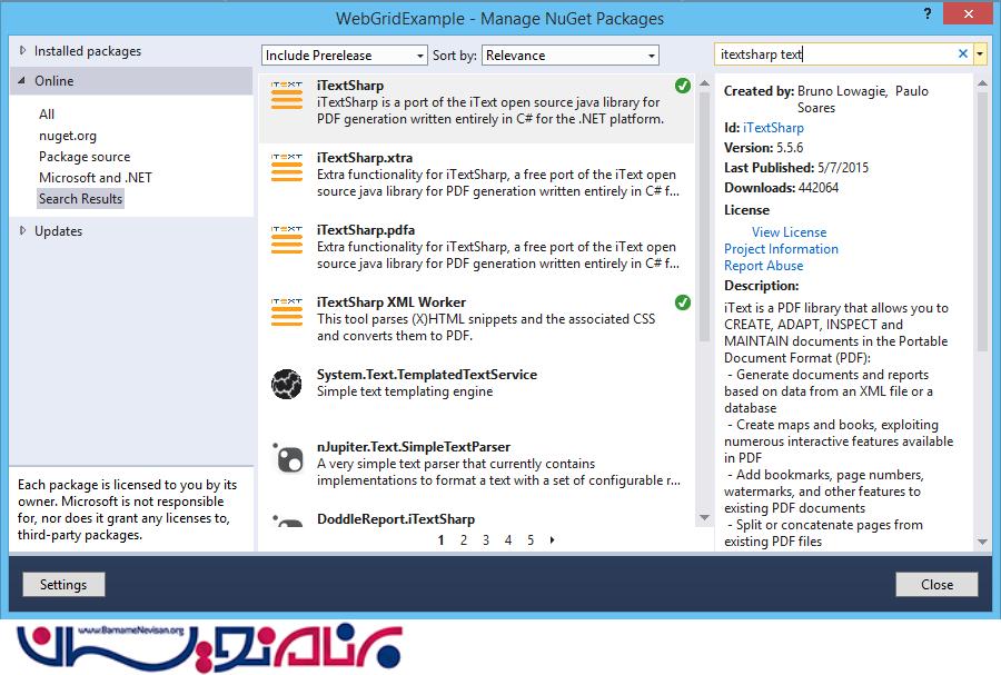 کلمه itextsharp را جستجو کرده و دو فایل dll زیر را نصب نمایید.