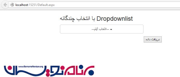 اما نکته دیگر، نگه داری داده ها بین Postbackها است. برای تست آن، از دکمه "دریافت داده" و Lableای که برای نمایش متن و مقدار آیتم انتخاب شده را نمایش می دهد، استفاده کرده ایم. با زدن دکمه، پس از Postback می توانیم خروجی را ببینیم.