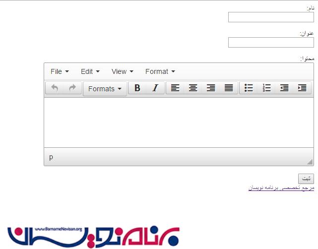 کدهای HTML زیر شامل یک فرم HTML می باشد که اجازه می دهد کاربر جزئیات صفحه پویا را، مانند نام خودش، عنوان و محتوا را ذخیره کند. TextBox صورت Multiline می باشد و با استفاده از پلاگین TinyMCE RichTextEditor آن را غنی ساخته ایم.