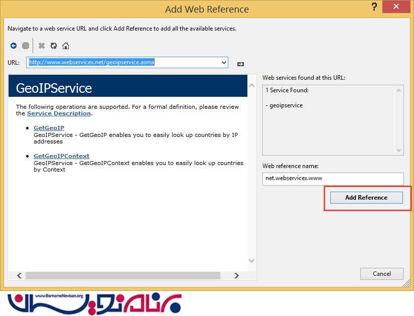 در پنجره باز شده در قسمت Url آدرس http://www.webservicex.net/geoipservice.asmx را وارد کنید