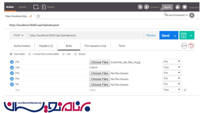 در تصویر بالا، ما بر روی bodyکلیک کرده وبعد گزینه form_data را انتخاب می کنیم. از ستون دوم یک فایل عکس انتخاب کرده و واز ستون DropDownList ها گزینه File را تعیین می کنیم.همچنین یک سطر بیشتر با عنوان size : original اضافه می کنیم.