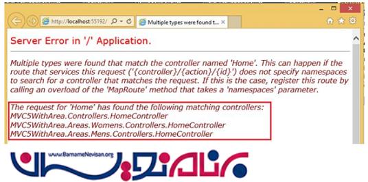 Exception تولید شده را مشاهده کنید که نشان می دهد ما چندین کنترلر Home در پروژه داریم پس برای حذف Exception از صفت های namespace در RouteConfig.cs استفاده می کنیم تا Exception حدف شود: