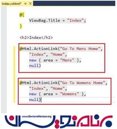 حالا اگر بخواهید مسیر درخواست خود را از کنترلر پیش فرض به کنترلر Area تغییر دهید باید یک action link اضافه کنید: