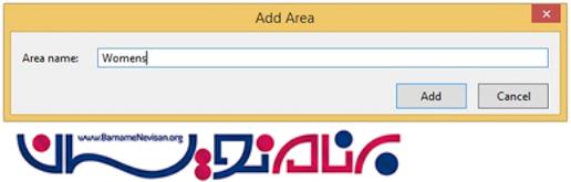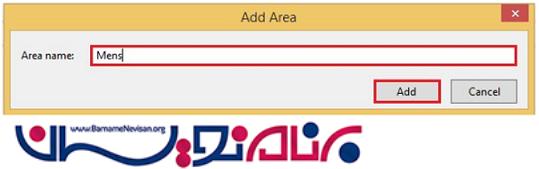 نام مناسبی طبق آنچه که می خواهید برای Area مشخص کنید.فرض می کنیم که یک وب سایت آن لاین برای خرید ایجاد کرده ایم که دو ماژول دارد، یکی برای آقایان و دیگری برای خانم ها، بنابراین باید دو Area به این برنامه اضافه کنیم.