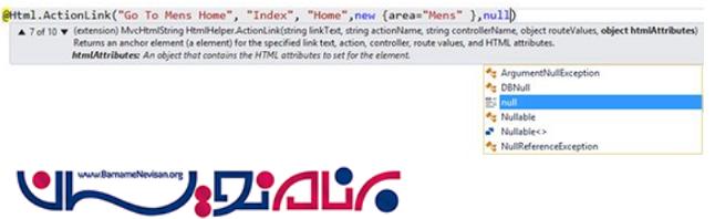 اما قبل از action link می توانید فقط در همان دامنه و یا Area مشابه درخواست ارسال کنید اما اگر بخواهید درخواستی به Area دیگر بفرستید باید از Action Link extension method استفاده کنید، مانند زیر: