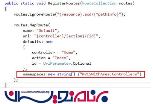 حالا فایل پیش فرض RouteConfig.cs را باز کنید تا namespace ها را برای مسیر پیش فرض تنظیم کنید: