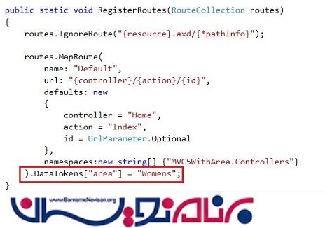 اگر بخواهیم آرگومان Area پیش فرض را در URL تنظیم کنیم باید از مجموعه DataToken برای اضافه کردن یک کلید به Area در RouteConfig.cs استفاده کنیم.