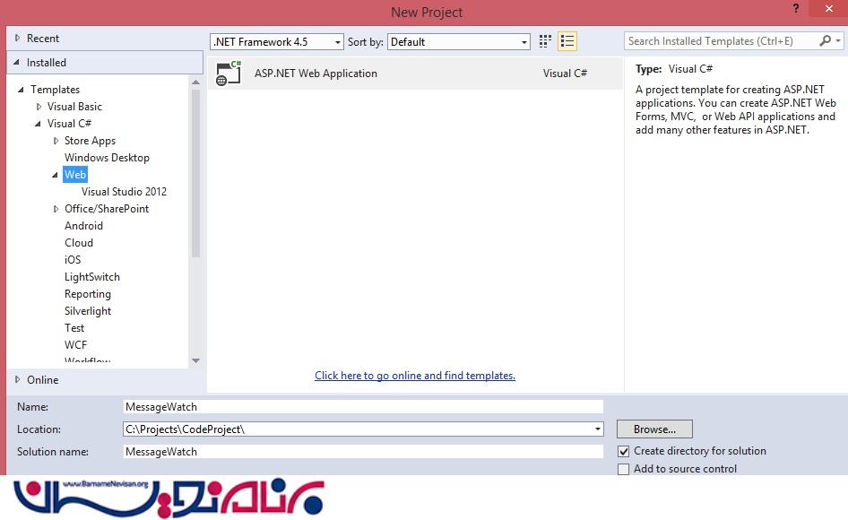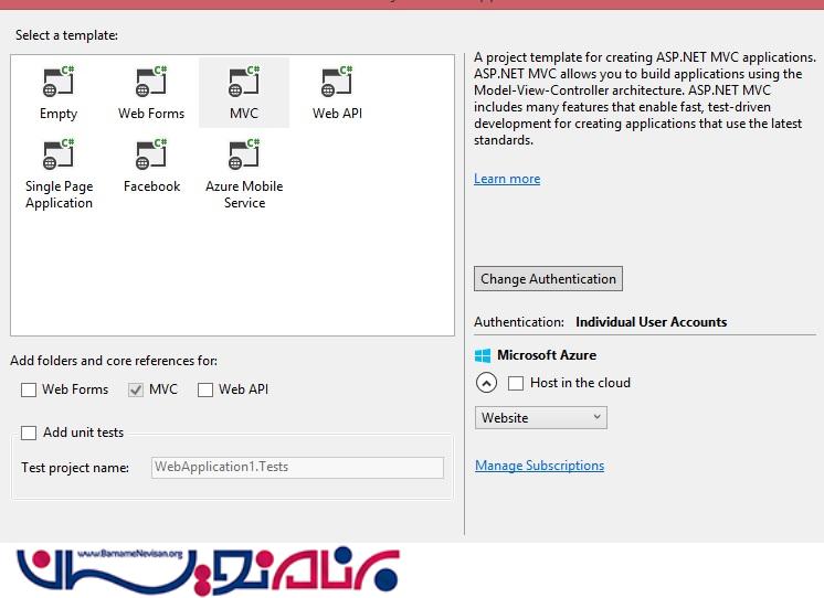 قدم دوم:Visual Studio را باز کنید و سپس ASP.Net Web را انتخاب می کنیم، و سپس یک صفحه ی MVC انتخاب می نمایید.به صورت زیر:
