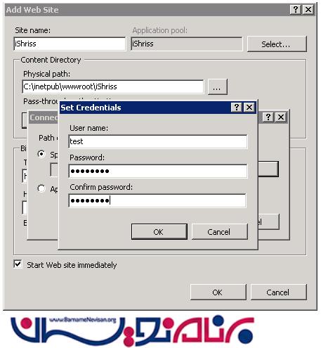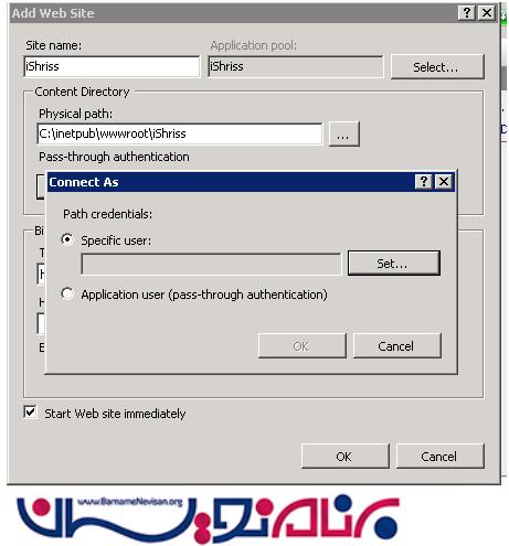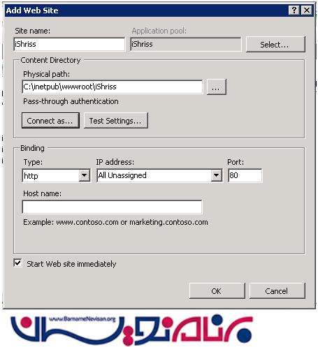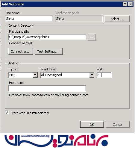 با اضافه کردن وب سایت یک کادر محاوره ای باز می شود، حالا نام و مسیر فیزیکی که فایل publish شده در آن قرار دارد را مشخص کنید.