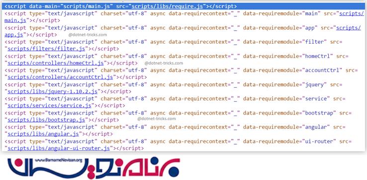 در اینجا ما رفرنس ها را به فایل require.js اضافه کردیم و دیگر فایل های JS به طور ناهمگام با استفاده از صفت data_main فایل scripts/main.js لود خواهد شد. فایل main.js برای تعریف ماژول های جاوا اسکریپت برنامه و فایل های dependency استفاده می شود.