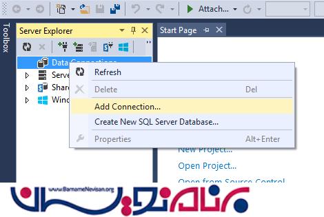 مرحله 3 - در منوی ویو گزینه Server Explorer را کلیک کنید تا پنجره مربوط به آن باز شود.بر روی Server Explorer کلیک راست کرده و add connection را بزنید