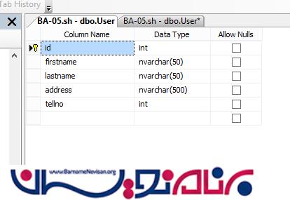 مرحله 1 - ابتدا در Sql به ایجاد یک دیتابیس می پردازیم .در داخل این دیتابیس برای سادگی فقط یک جدول Users اضافه می کنیم.فیلد های این جدول به صورت زیر خواهد بود