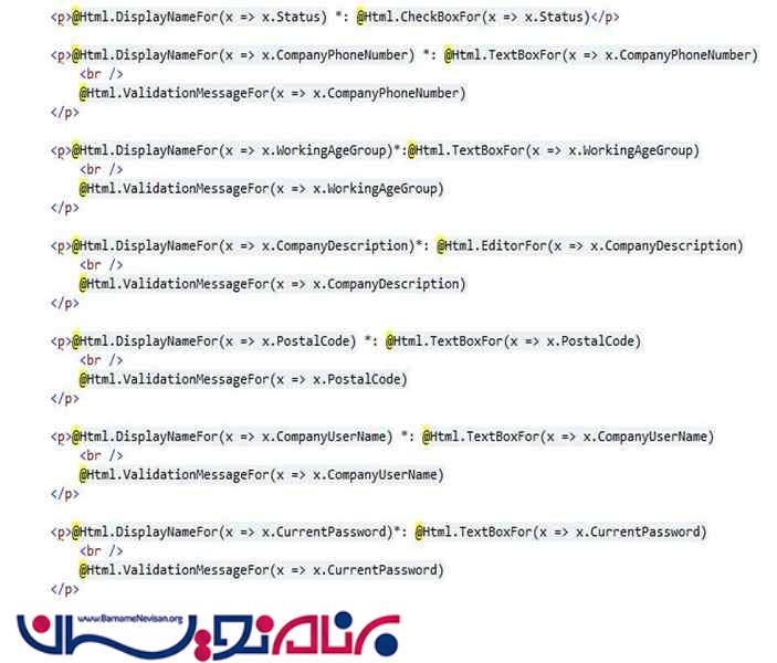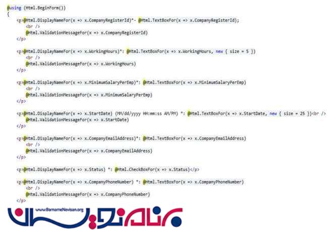سپس شما ورودی و اعتبارسنجی هایی که در مدل پیاده سازی کردید اضافه می نمایید. این مهم است که ورودی های فرم باید درون BeginForm باشند :