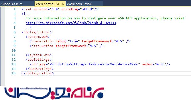 دقت داشته باشید که برای این که کنترل هایی که برای اعتبارسنجی اضافه کردید کار کنند ابتدا باید در فایل Web.Config دستور زیر را اضافه نمایید.