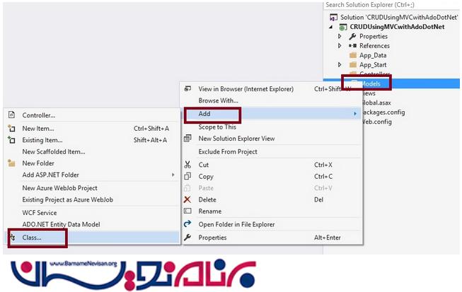توجه: کلاس مدل لزوما نباید در پوشه Model باشد و این فقط برای نظم و خوانایی بیشتر در پروژه می باشد ،شما می توانید این کلاس را در هر جای دیگری از solution explorer بسازید. این یعنی کلاس می تواند در پوشه ای با نام دیگر و یا حتی بدون پوشه و در کتابخانه کلاس به صورت جداگانه ساخته شود.
