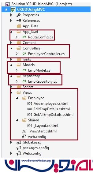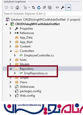 در اینجا پوشه Repository را می سازیم و کلاس EmpRepository.cs را برای عملیات پایگاه داده مربوط اضافه می کنیم. بعد از اضافه کردن آن، solution explorer به صورت زیر خواهد شد: