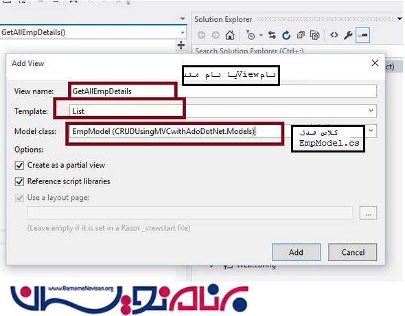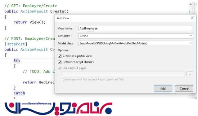 برای ایجاد Partial view و AddEmployee، بر روی متد ActionResult کلیک راست کرده و سپس بر روی View کلیک کنید. حالا نام View را مشخص کنید و مانند شکل زیر عمل کنید: