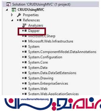 بعد از نصب کتابخانه dapper ، منابع(رفرنس های ) به solution explorer پروژه MVC شما اضافه خواهد شد مانند زیر: