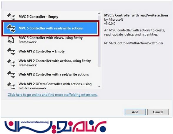 بعد از کلیک بر روی دکمه Add کنترلری ایجاد می شود که با کد های پیش فرض از عملیات CRUD پشتیبانی می کند و ما می توانیم آن را طبق نیازمندی های خود تغییر دهیم.