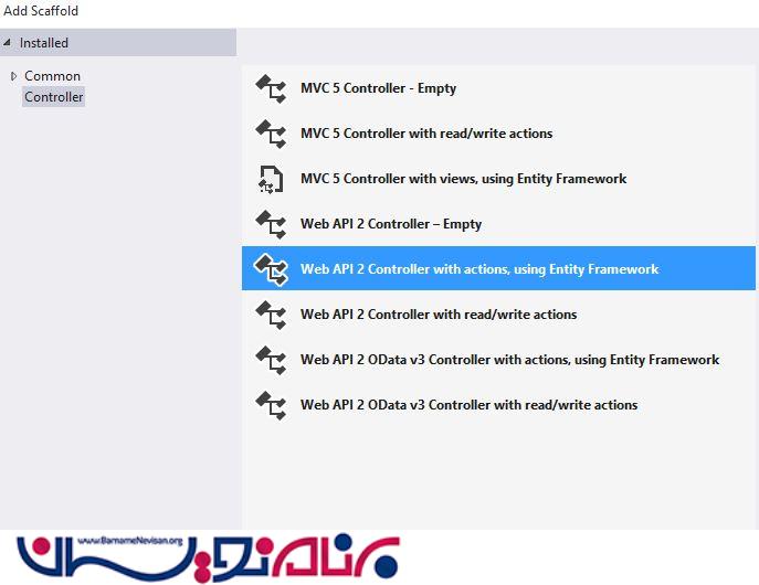 سپس گزینه controller a web api را انتخاب کنید . ایجاد این کلاس در شکل زیر نمایش داده شده است.