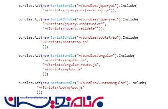 در شکل زیر Jquery و AngularJS وBootStrap به پروژه اضافه شده است .همچنین در داخل Script یک پوشه دیگر به نام App افزوده و داخل آن myapp.js را اضافه کرده ایم .