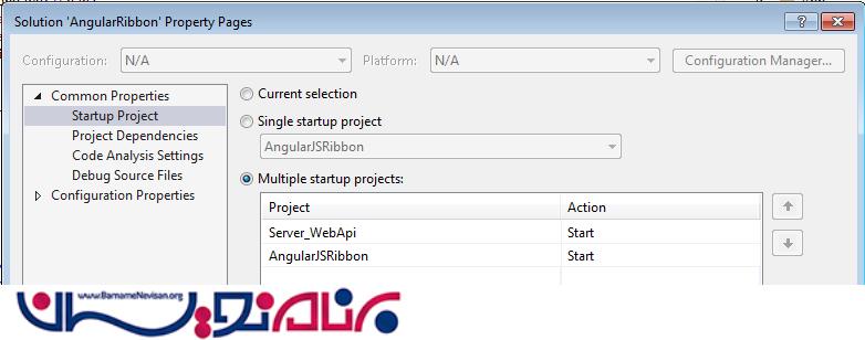 فقط قبل از اجرای برنامه مطمئن شوید که اول وب سرویس اجرا میشود برای این کار روی solution راست کلیک کنید و گزینه set startup project را انتخاب کنید. تنظیمات را مانند شکل انجام دهید.