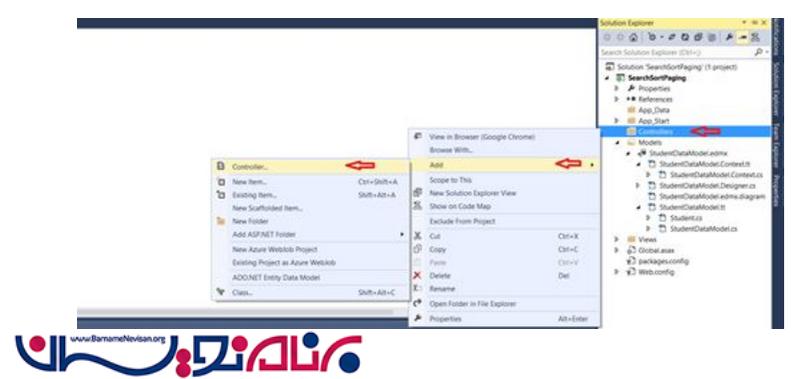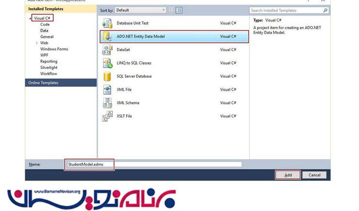 حال برای اتصال به بانک اطلاعاتی روی پروژه راست کلیک کرده و در Add> NewItem <ADO.NET Entity Data Model. را برای اتصال به بانک اطلاعاتی انتخاب میکنیم