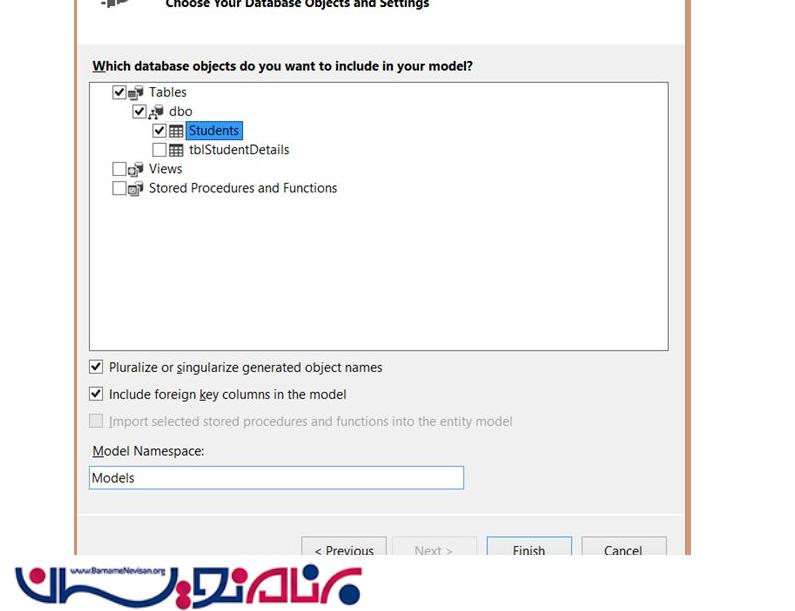 در این مرحله نام جدولی که را که در sql ساختیم را انتخاب میکنیم و در آخر گزینه Finish را میزنیم