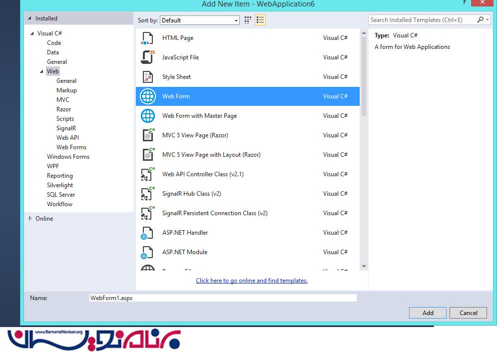 حال روی پروژه راست کلیک کرده ویک webform ایجاد میکنیم