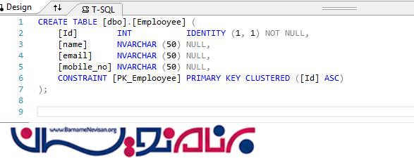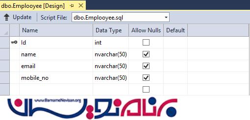مرحله پنجم:همان طور که می دانید ما در MVC، یک Model داریم بنابر این یک جدول به نام Employee می سازید و یک کلید اصلی با خاصیت Identity به نام ID تنظیم می نمایید.