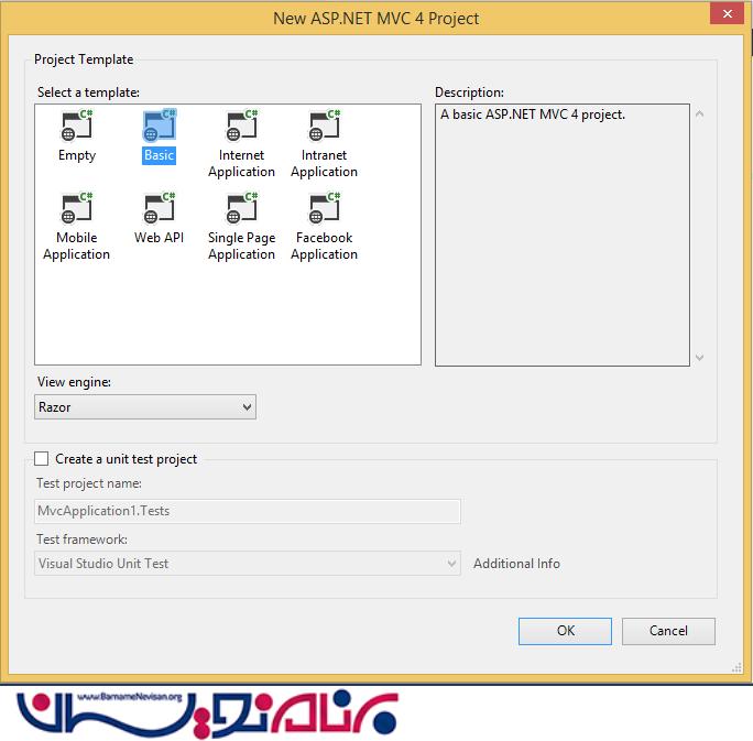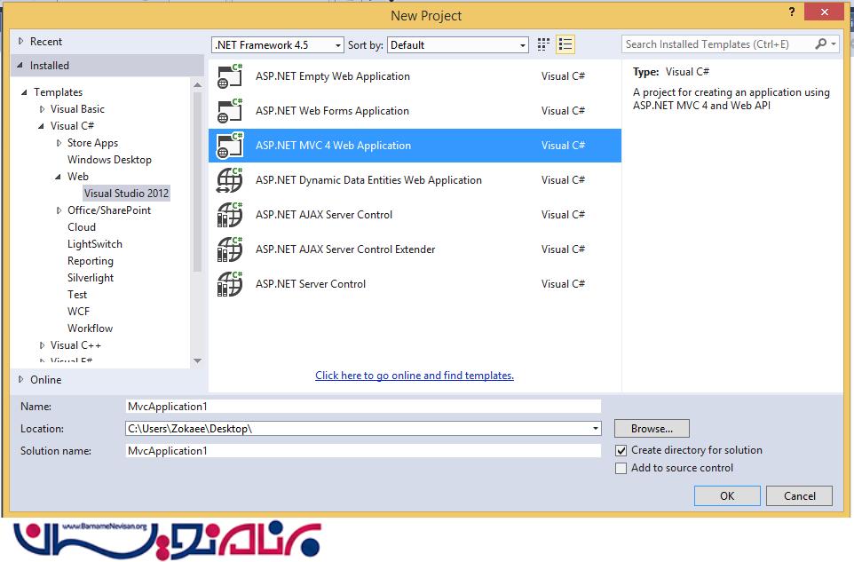 مرحله اول:ابتدا شما یک پروژه ی جدید MVC می سازید،به صورت تصویر زیر: