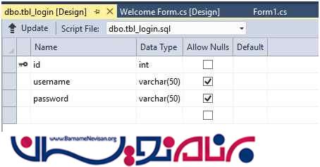 در sql بانک خود را بسازید البته ما بانک را در پروژه قرار دادیم که میتوانید ان را به بانک اضافه کنید. به هر حال یک جدول مطابق شکل بسازید.