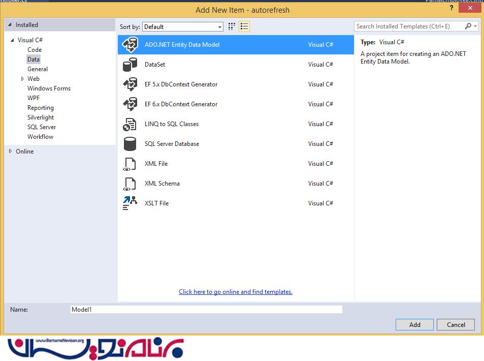 بعد از این کار در پنجره ای که باز می شود EF Designer from Database را انتخاب می کنیم .با این کار به mvc اعلام می کنیم که قصد داریم مدل خود را از روی یک بانکی که قبلا ساخته ایم ایجاد کنیم .در مرحله بعد از شما نام دیتابیس و جدول مربوطه خواسته خواهد شد :مانند شکل زیر