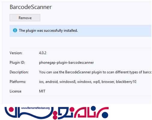 اگر شما خواستار حذف این پلاگین باشید می توانید روی دکمه Remove کلیک نمایید. اما این کار را حالا انجام ندهید. ما از این پلاگین برای ساخت برنامه اسکنر بارکد استفاده خواهیم نمود.