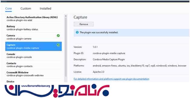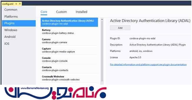 حالا اگر روی قسمت Platforms کلیک کنید نسخه Cordova فعلی پروژه را مشاهده خواهید نمود. حالا روی قسمت پلاگین کلیک کرده و لیست هسته های پلاگین ها را مانند زیر مشاهده خواهید نمود. شما می توانید هر پلاگینی را با کلیک روی دکمه Add اضافه نمایید.