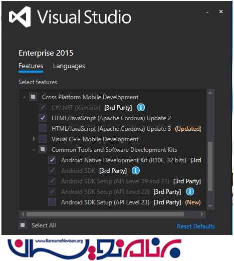 در هنگام نصب Visual Studio 2015 شما نیاز به انتخاب Cross Platform Mobile Development در قسمت ویژگی ها دارید. همچنین باید آپدیت HTML5 / JavaScript (Apache Cordova روی 2/3 باشد. سپس روی دکمه Install کلیک کنید.
